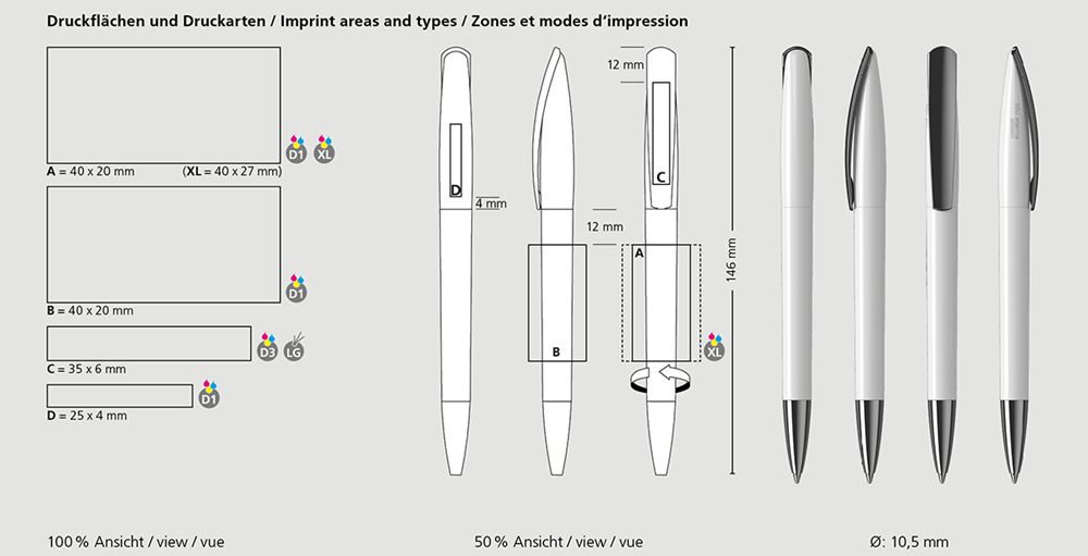 Der Arca high gloss MMn ist ein Drehkugelschreiber. Materialien und Oberflächen: Spitze: Messing vernickelt. Schaft und Oberteil: Kunststoff (ABS) hochglänzend. Klipp: Federstahl vernickelt. Minenröhrchen: Recyceltes Polypropylen (rPP). Standardfarben: Schaft und Oberteil: aus 14 Farben kombinierbar. Sonderfarben: ab 5.000 Stück, ab 25.000 Stück ohne PMS-Zuschlag. Standardmine: Silktech L (3.000 m), blau oder schwarz, Mine optional: Silktech XL, Multifill P, Multi-Gel.