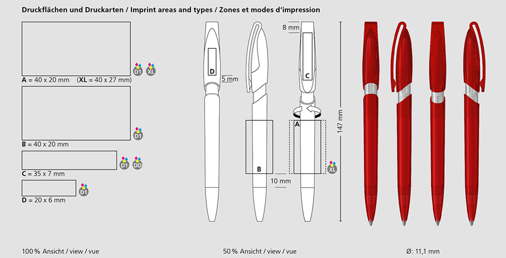 Der Rodeo transparent ist ein Druckkugelschreiber. Materialien und Oberflächen: Spitze, Schaft, Hülse, Oberteil und Klipp: Kunststoff (M-ABS) transparent. Minenröhrchen: Recyceltes Polypropylen (rPP). Standardfarben: Spitze, Schaft, Hülse, Oberteil und Klipp: aus 12 Farben kombinierbar. Sonderfarben: ab 5.000 Stück, ab 25.000 Stück ohne PMS-Zuschlag. Standardmine: Silktech L (3.000 m), blau oder schwarz, Mine optional: Silktech XL, Multifill P, Multi-Gel.