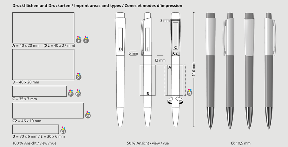 Der Zeno high gloss Mn ist ein Druckkugelschreiber. Materialien und Oberflächen: Spitze: Messing vernickelt. Schaft, Oberteil und Drücker: Kunststoff (ABS) hochglänzend. Minenröhrchen: Recyceltes Polypropylen (rPP). Standardfarben: Schaft, Oberteil und Drücker: aus 14 Farben kombinierbar. Sonderfarben: ab 3.000 Stück, ab 25.000 Stück ohne PMS-Zuschlag. Standardmine: Silktech L (3.000 m), blau oder schwarz, Mine optional: Silktech XL, Multifill P, Multi-Gel.