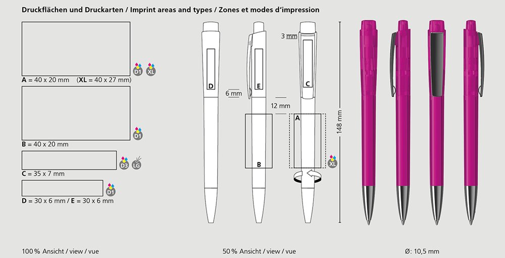 Der Zeno transparent MMn ist ein Druckkugelschreiber. Materialien und Oberflächen: Spitze: Messing vernickelt. Schaft, Oberteil und Drücker: Kunststoff (M-ABS) transparent. Klipp: Federstahl vernickelt. Minenröhrchen: Recyceltes Polypropylen (rPP). Standardfarben: Schaft, Oberteil und Drücker: aus 12 Farben kombinierbar. Sonderfarben: ab 5.000 Stück, ab 25.000 Stück ohne PMS-Zuschlag. Standardmine: Silktech L (3.000 m), blau oder schwarz, Mine optional: Silktech XL, Multifill P, Multi-Gel.