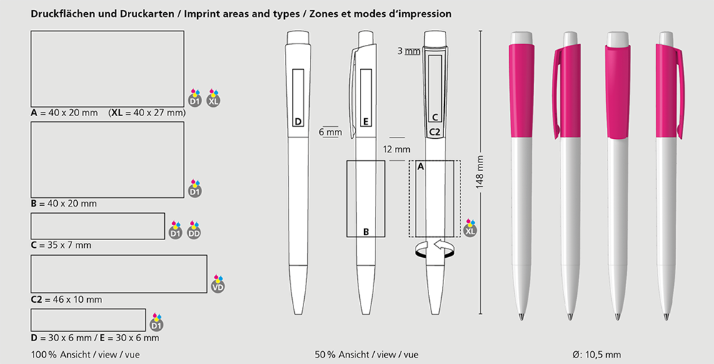 Der Zeno high gloss ist ein Druckkugelschreiber. Materialien und Oberflächen: Spitze, Schaft, Oberteil und Drücker: Kunststoff (ABS) hochglänzend. Minenröhrchen: Recyceltes Polypropylen (rPP). Standardfarben: Spitze, Schaft, Oberteil und Drücker: aus 14 Farben kombinierbar. Sonderfarben: ab 3.000 Stück, ab 25.000 Stück ohne PMS-Zuschlag. Standardmine: Silktech L (3.000 m), blau oder schwarz, Mine optional: Silktech XL, Multifill P, Multi-Gel.