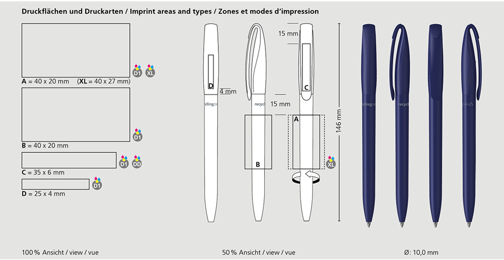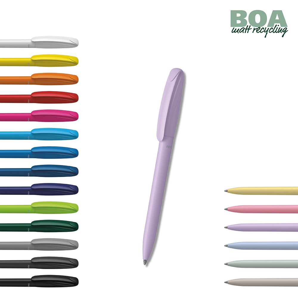 Der Boa matt recycling ist ein Drehkugelschreiber. Materialien und Oberflächen: Schaft und Oberteil: Kunststoff (rABS) matt, recycelt. Oberteil: Mix aus matten und glänzenden Flächen. Minenröhrchen: Recyceltes Polypropylen (rPP). Standardfarben: Schaft und Oberteil: aus 20 Farben kombinierbar. Hinweis: Aufgrund der recycelten Rohstoffe kann es zu Farbabweichungen auch bei einzelnen Bauteilen eines Produktes kommen. Sonderfarben: ab 3.000 Stück, ab 25.000 Stück ohne PMS-Zuschlag. Standardmine: Silktech L (3.000 m), blau oder schwarz, Mine optional: Silktech XL, Multifill P, Multi-Gel.