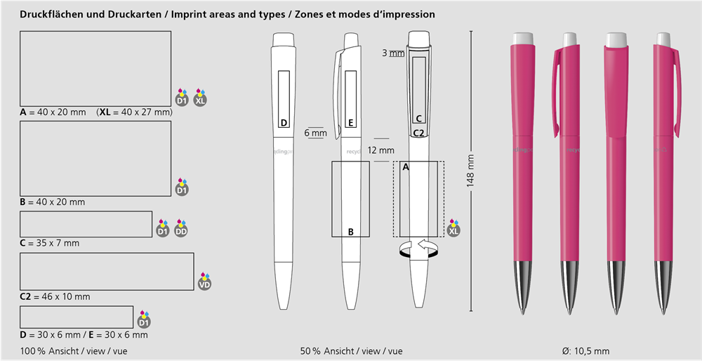 Der Zeno recycling Mn ist ein Druckkugelschreiber. Materialien und Oberflächen: Spitze: Messing vernickelt. Spitze, Schaft, Oberteil und Drücker: Kunststoff (rABS) hochglänzend, recycelt. Minenröhrchen: Recyceltes Polypropylen (rPP). Standardfarben: Schaft, Oberteil und Drücker: aus 14 Farben kombinierbar. Hinweis: Aufgrund der recycelten Rohstoffe kann es zu Farbabweichungen auch bei einzelnen Bauteilen eines Produktes kommen. Sonderfarben: ab 3.000 Stück, ab 25.000 Stück ohne PMS-Zuschlag. Standardmine: Silktech L (3.000 m), blau oder schwarz, Mine optional: Silktech XL, Multifill P, Multi-Gel.
