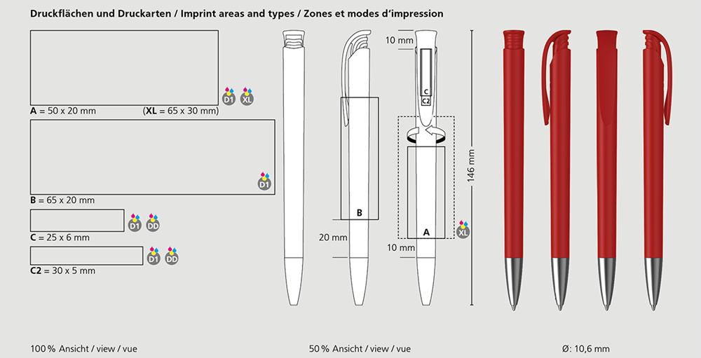 Der Jona matt Ms ist ein Druckkugelschreiber. Materialien und Oberflächen: Spitze: Messing mattverchromt. Schaft und Drückerklipp: Kunststoff (ABS) matt. Minenröhrchen: Recyceltes Polypropylen (rPP). Standardfarben: Schaft und Drückerklipp: aus 4 Farben kombinierbar. Sonderfarben: ab 5.000 Stück, ab 25.000 Stück ohne PMS-Zuschlag. Standardmine: Silktech L (3.000 m), blau oder schwarz, Mine optional: Silktech XL, Multifill P, Multi-Gel.