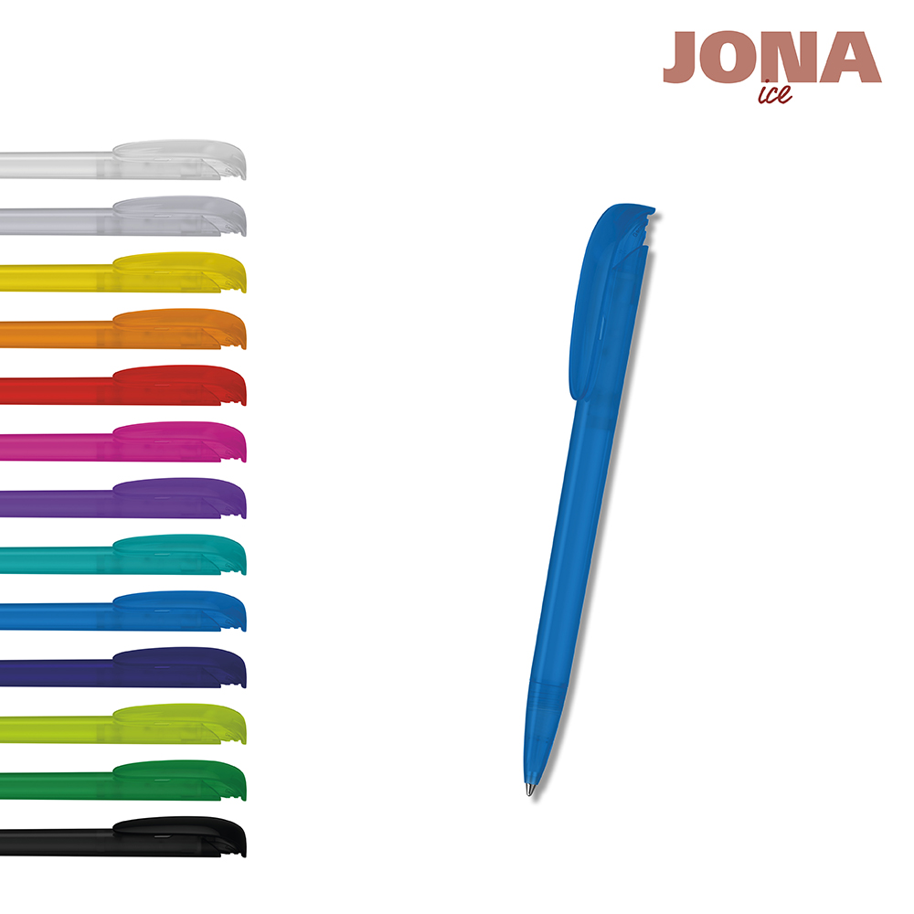 Der Jona ice ist ein Druckkugelschreiber. Materialien und Oberflächen: Spitze, Schaft und Drückerklipp: Kunststoff (M-ABS) gefrostet. Minenröhrchen: Recyceltes Polypropylen (rPP). Standardfarben: Spitze, Schaft und Drückerklipp: aus 12 Farben kombinierbar. Sonderfarben: ab 5.000 Stück, ab 25.000 Stück ohne PMS-Zuschlag. Standardmine: Silktech L (3.000 m), blau oder schwarz, Mine optional: Silktech XL, Multifill P, Multi-Gel.