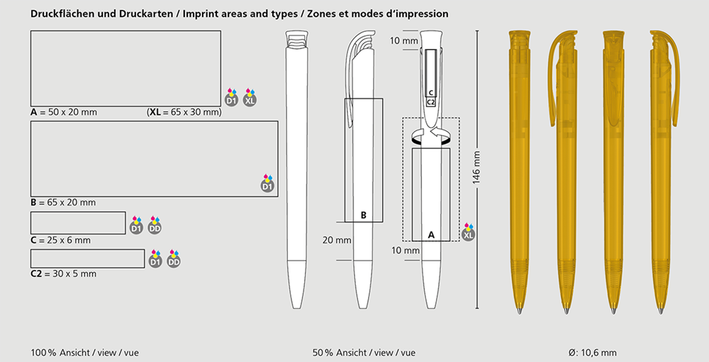 Der Jona transparent ist ein Druckkugelschreiber. Materialien und Oberflächen: Spitze, Schaft und Drückerklipp: Kunststoff (M-ABS) transparent. Minenröhrchen: Recyceltes Polypropylen (rPP). Standardfarben: Spitze, Schaft und Drückerklipp: aus 12 Farben kombinierbar. Sonderfarben: ab 3.000 Stück, ab 25.000 Stück ohne PMS-Zuschlag. Standardmine: Silktech L (3.000 m), blau oder schwarz, Mine optional: Silktech XL, Multifill P, Multi-Gel.