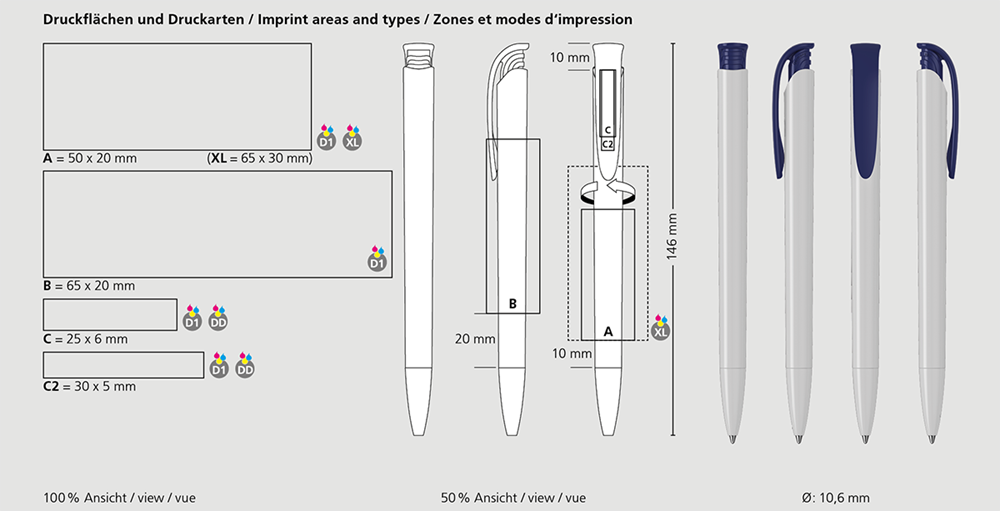 Der Jona high gloss ist ein Druckkugelschreiber. Materialien und Oberflächen: Spitze, Schaft und Drückerklipp: Kunststoff (ABS) hochglänzend. Minenröhrchen: Recyceltes Polypropylen (rPP). Standardfarben: Spitze, Schaft und Drückerklipp: aus 14 Farben kombinierbar. Sonderfarben: ab 3.000 Stück, ab 25.000 Stück ohne PMS-Zuschlag. Standardmine: Silktech L (3.000 m), blau oder schwarz, Mine optional: Silktech XL, Multifill P, Multi-Gel.