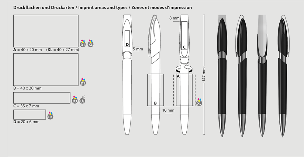Der Rodeo high gloss MMn ist ein Druckkugelschreiber. Materialien und Oberflächen: Spitze: Messing vernickelt. Schaft: Kunststoff (ABS) hochglänzend. Hülse: Metallisiert. Oberteil: Kunststoff (ABS) hochglänzend. Klipp: Federstahl vernickelt. Minenröhrchen: Recyceltes Polypropylen (rPP). Standardfarben: Schaft und Oberteil: aus 14 Farben kombinierbar. Sonderfarben: ab 5.000 Stück, ab 25.000 Stück ohne PMS-Zuschlag. Standardmine: Silktech L (3.000 m), blau oder schwarz, Mine optional: Silktech XL, Multifill P, Multi-Gel.