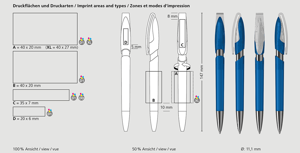 Der Rodeo transparent Mn ist ein Druckkugelschreiber. Materialien und Oberflächen: Spitze: Messing vernickelt. Schaft: Kunststoff (M-ABS) transparent. Hülse: Metallisiert. Oberteil und Klipp: Kunststoff (M-ABS) transparent. Minenröhrchen: Recyceltes Polypropylen (rPP). Standardfarben: Schaft, Oberteil und Klipp: aus 12 Farben kombinierbar. Sonderfarben: ab 5.000 Stück, ab 25.000 Stück ohne PMS-Zuschlag. Standardmine: Silktech L (3.000 m), blau oder schwarz, Mine optional: Silktech XL, Multifill P, Multi-Gel.