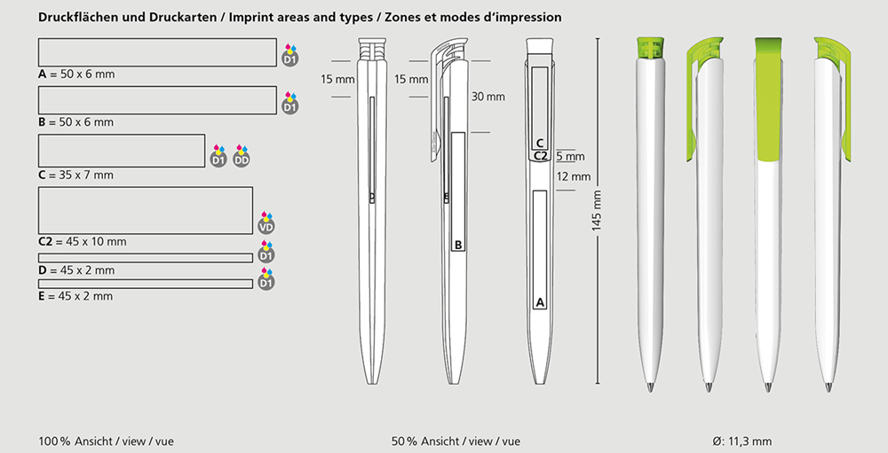 Der Trias high gloss ist ein Druckkugelschreiber. Materialien und Oberflächen: Schaft und Drückerklipp: Kunststoff (ABS) hochglänzend. Minenröhrchen: Recyceltes Polypropylen (rPP). Standardfarben: Schaft und Drückerklipp: aus 14 Farben kombinierbar. Sonderfarben: ab 3.000 Stück, ab 25.000 Stück ohne PMS-Zuschlag. Standardmine: Silktech L (3.000 m), blau oder schwarz, Mine optional: