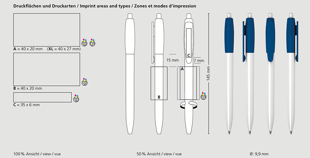 Der Klix high gloss ist ein Druckkugelschreiber. Materialien und Oberflächen: Schaft, Oberteil und Drücker: Kunststoff (ABS) hochglänzend. Minenröhrchen: Recyceltes Polypropylen (rPP). Standardfarben: Schaft, Oberteil und Drücker: aus 14 Farben kombinierbar. Sonderfarben: ab 5.000 Stück, ab 25.000 Stück ohne PMS-Zuschlag. Standardmine: Silktech L (3.000 m), blau oder schwarz, Mine optional: Silktech XL, Multifill P, Multi-Gel.