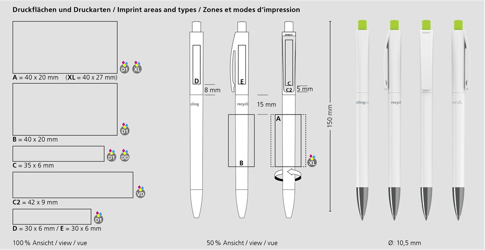 Der Qube recycling Mn ist ein Druckkugelschreiber. Materialien und Oberflächen: Spitze: Messing vernickelt. Schaft, Oberteil und Drücker: Kunststoff (rABS) hochglänzend, recycelt. Minenröhrchen: Recyceltes Polypropylen (rPP). Standardfarben: Schaft, Oberteil und Drücker: aus 14 Farben kombinierbar. Hinweis: Aufgrund der recycelten Rohstoffe kann es zu Farbabweichungen auch bei einzelnen Bauteilen eines Produktes kommen. Sonderfarben: ab 5.000 Stück, ab 25.000 Stück ohne PMS-Zuschlag. Standardmine: Silktech L (3.000 m), blau oder schwarz, Mine optional: Silktech XL, Multifill P, Multi-Gel.