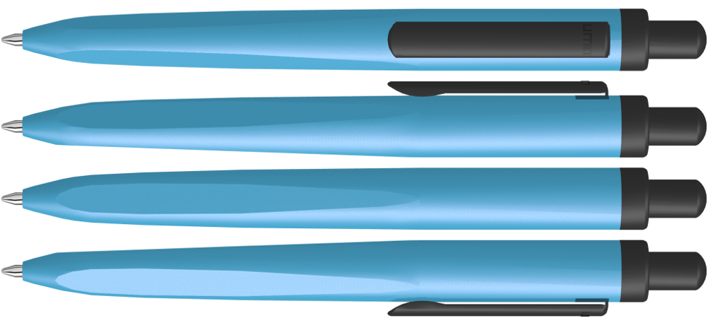 Metall-Druckkugelschreiber mit gemetrisch wechselnder Schaftform, die sich zur Schreibspitze hin in eine prägnante Dreikantgeometrie verjüngt. Aluminiumgehäuse matt lackiert, Clip und Drücker in schwarz matt.