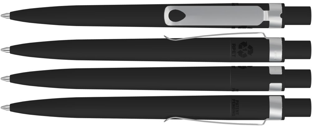 Druckkugelschreiber mit gummiertem Gehäuse aus recyceltem PET-Material mit Metallclip matt verchromt.