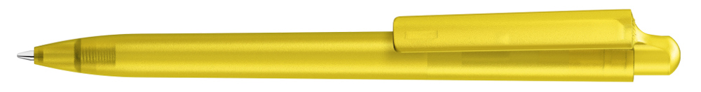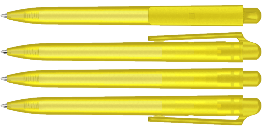 Druckkugelschreiber mit transparent gefrostetem Gehäuse und Clipdrücker.