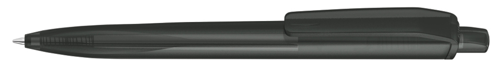 Druckkugelscheiber mit transparent gefrostetem Gehäuse, Clip und Drücker aus recyceltem ABS Kunststoff. Griffzone ergonomisch geformt.