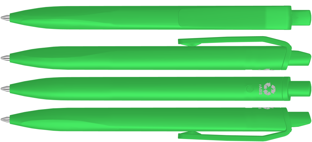 Druckkugelscheiber mit gedeckt mattem Gehäuse, Clip und Drücker aus recyceltem ABS-Kunststoff. Griffzone ergonomisch geformt.
