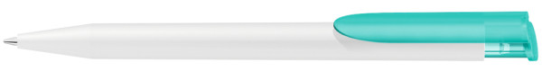 Druckkugelschreiber mit gedeckt mattem Gehäuse in weiß und farbig transparent gefrostetem Clipdrücker.
