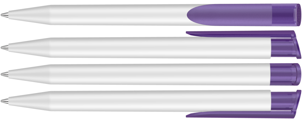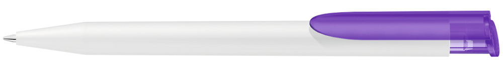 Druckkugelschreiber mit gedeckt mattem Gehäuse in weiß und farbig transparent gefrostetem Clipdrücker.