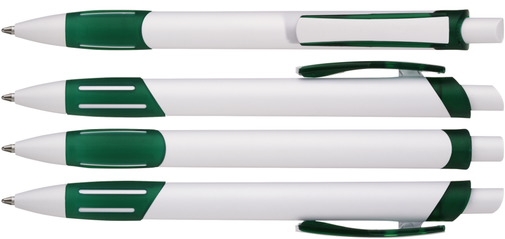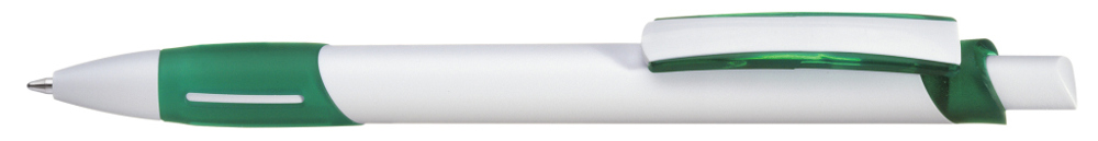 Druckkugelschreiber mit gedeckt weißem Gehäuse, transparent gefrosteter Gummigriffzone, Zierring und Clipschale.