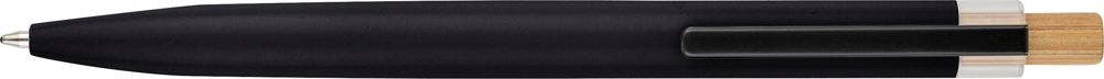 Druckkugelschreiber aus recyceltem Aluminium mit Bambusdrücker, rPET-Besatz und Metallclip. Mit eingraviertem Recycling-Logo. Schreiblänge ca. 700m. Blaue Tinte.