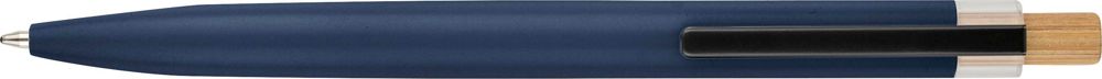 Druckkugelschreiber aus recyceltem Aluminium mit Bambusdrücker, rPET-Besatz und Metallclip. Mit eingraviertem Recycling-Logo. Schreiblänge ca. 700m. Blaue Tinte.