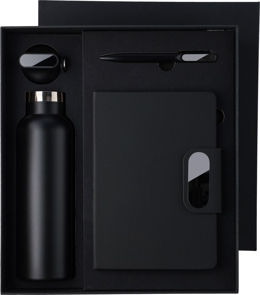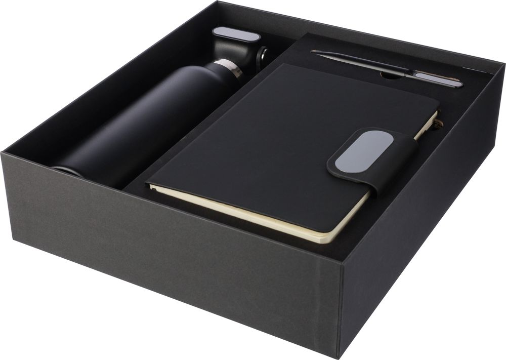 Dieses Geschenkset aus Karton besteht aus einer doppelwandigen Trinkflasche aus recyceltem Edelstahl (304) mit Silikongriff, einem Drehkugelschreiber aus recyceltem Aluminium mit blauer Tinte sowie einem Notizbuch aus recyceltem PU mit 80 Blatt 70 g/m² liniertem FSC-Papier. Das Notizbuch verfügt über ein Lesezeichen mit Band sowie einen magnetischen Metallverschluss mit Gravurplatte aus Rotguss. Alle Artikel sind mit einem recycelten Logo versehen: Es ist auf der Flasche und dem Kugelschreiber eingraviert und auf dem Notizbuch geprägt.
