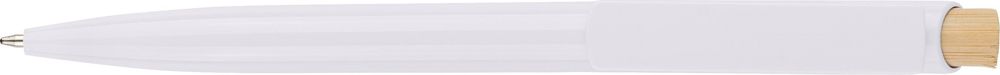 Recycelter ABS-Kugelschreiber mit Bambus-Druckknopf und weißem Clip. Mit recyceltem Logo im In-Mould-Verfahren. Ungefähre Schreiblänge 600 Meter. Blaue Tinte.