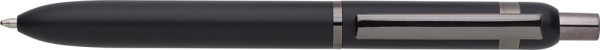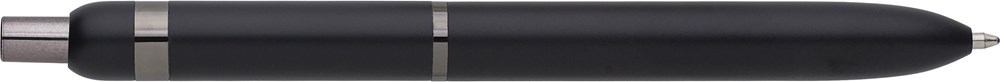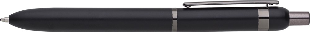 Kugelschreiber aus Aluminium und Messing. Mit glänzenden Details an Clip, Ring und Druckknopf. Blaue Tinte. Einzeln verpackt in magnetischer Geschenkbox mit Papierhülle.