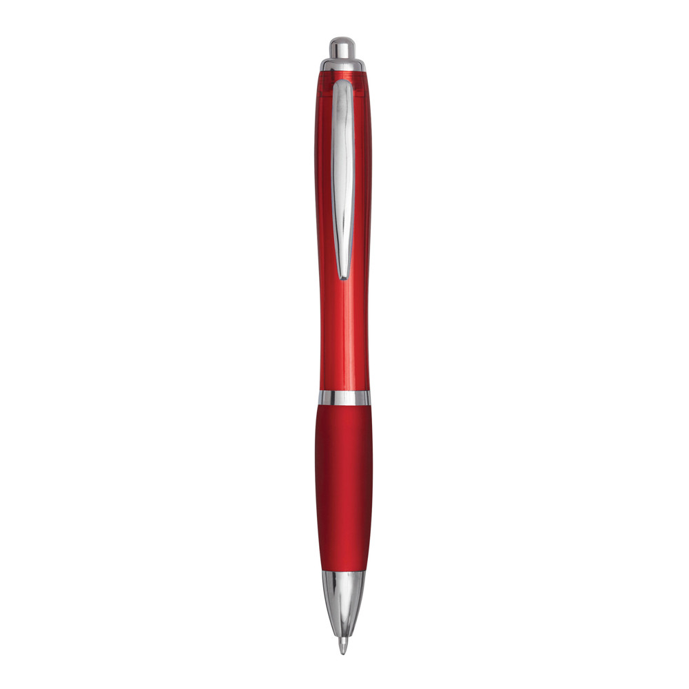 Kugelschreiber SWAYRABS: mit Schaft in taillierter Form aus recyceltem Kunststoff, gummierter Griffzone, Druckmechanismus, Großraummine, blauschreibend