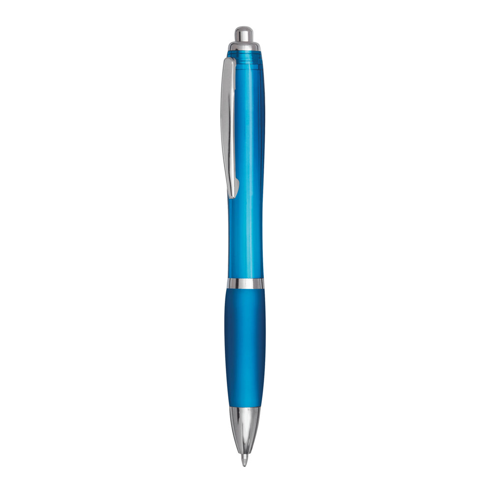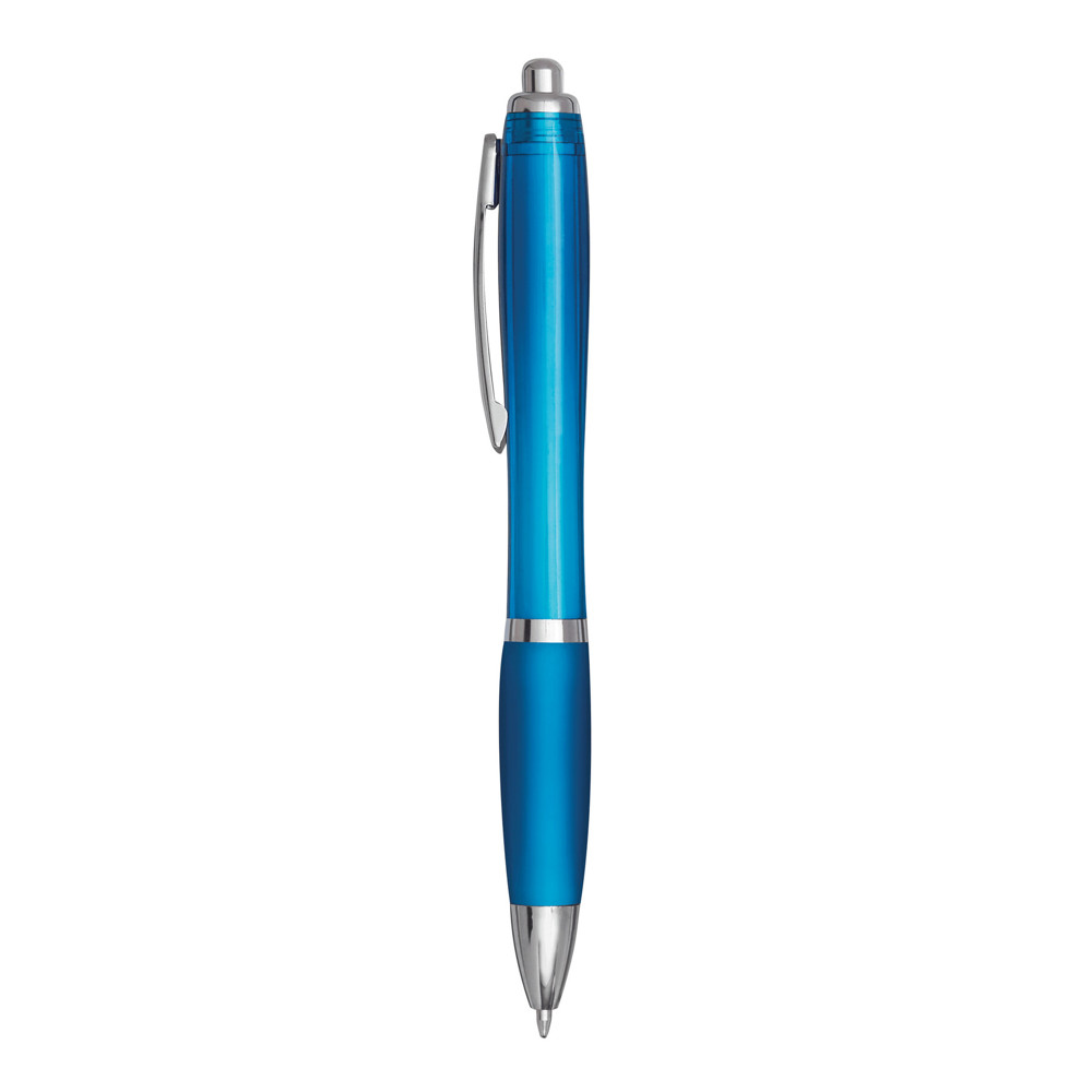 Kugelschreiber SWAYRABS: mit Schaft in taillierter Form aus recyceltem Kunststoff, gummierter Griffzone, Druckmechanismus, Großraummine, blauschreibend