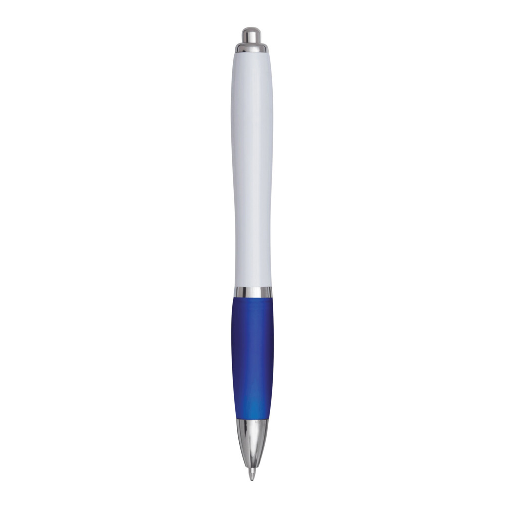 Kugelschreiber SWAYRABS: mit Schaft in taillierter Form aus recyceltem Kunststoff, gummierter Griffzone, Druckmechanismus, Großraummine, blauschreibend