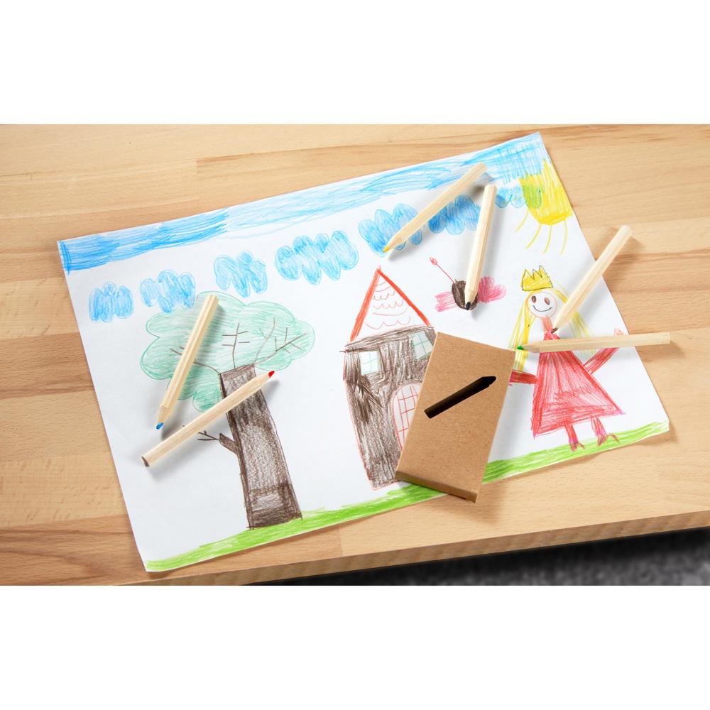 Kurze Malstifte aus unlackiertem Holz als 6er Set im Karton verpackt. Die Stifte sind sechseckig. mehr
