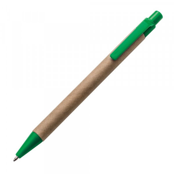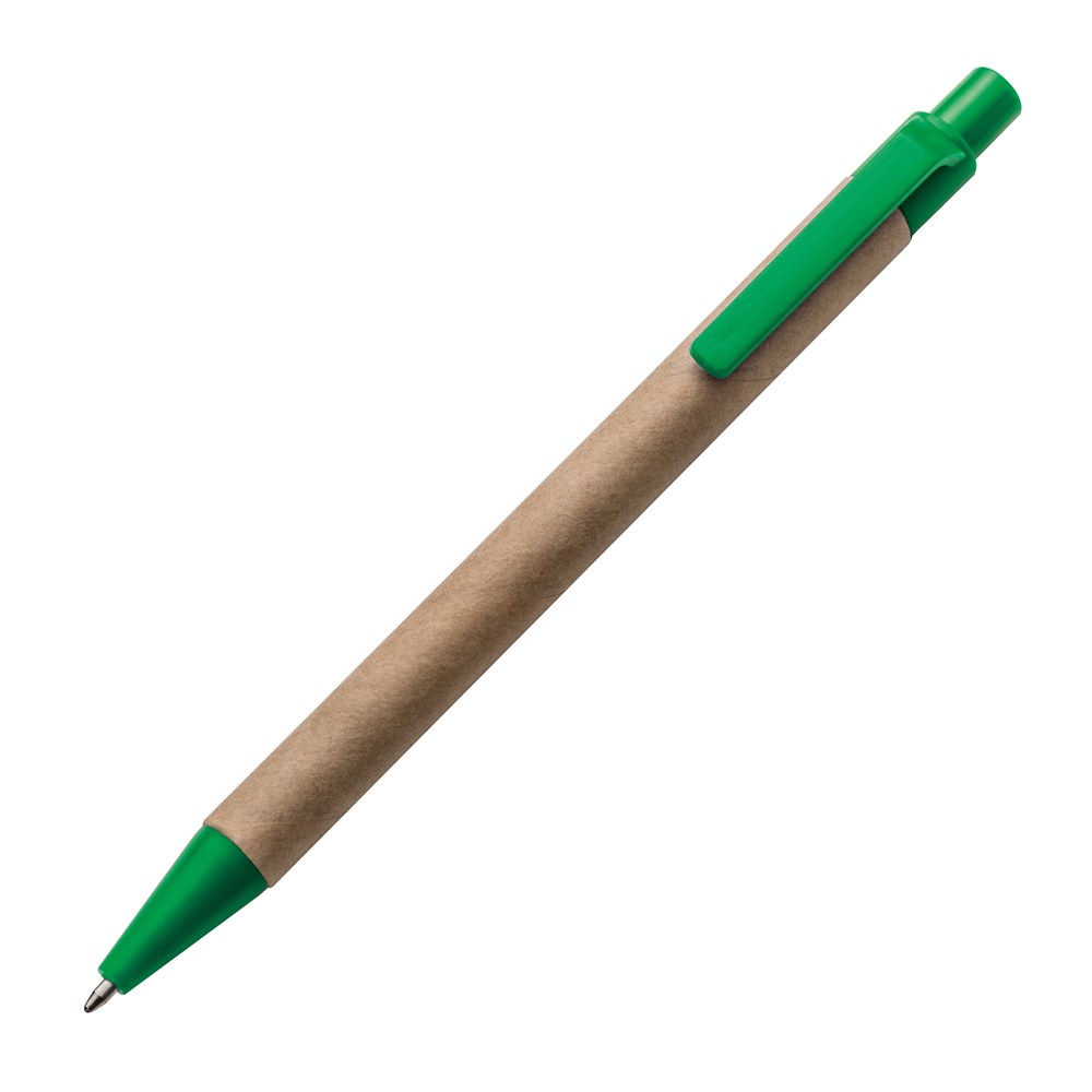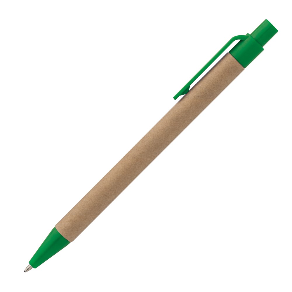 Kugelschreiber aus recycelter Pappe und farbigen Applikationen mit blauschreibender Mine. Die Werbung drucken wir unterhalb vom Clip.