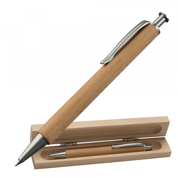 Kugelschreiber mit einer blauschreibenden Metallsystemmine und einem Etui, beides aus Buchenholz gefertigt. Ihre Werbung bringen wir mittels einer Lasergravur unterhalb vom Clip an.
