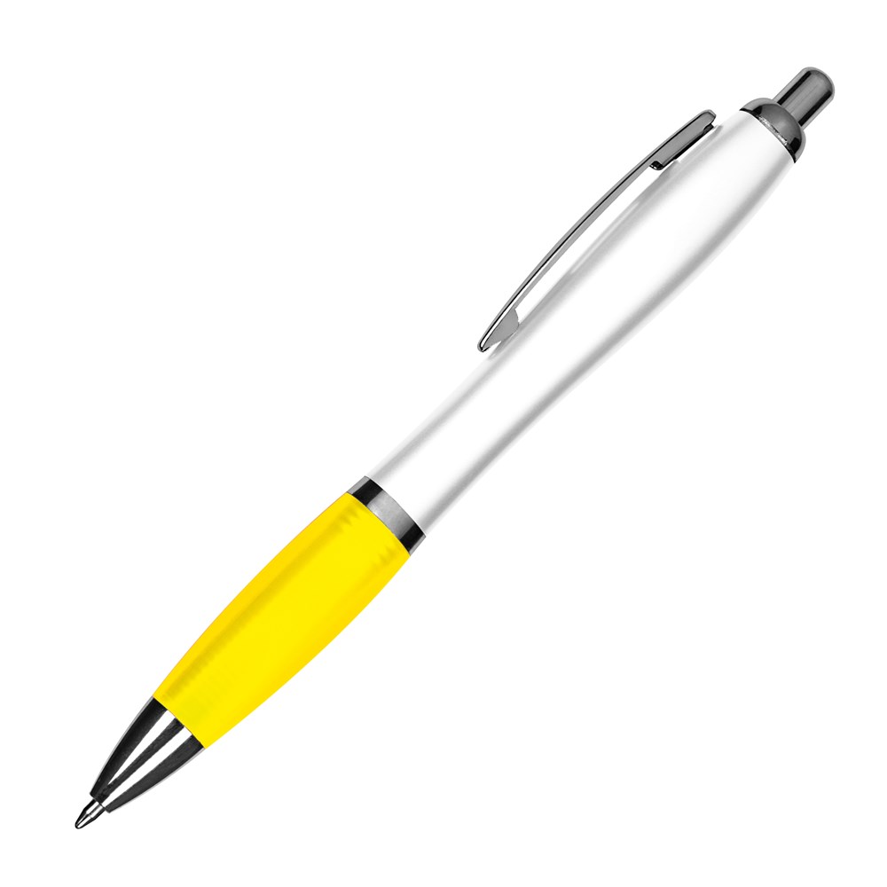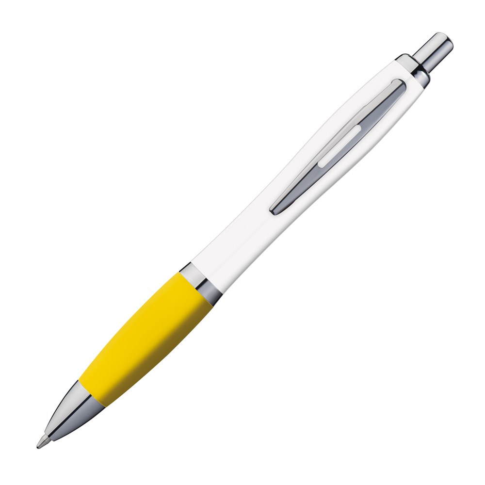 TOP PRICE! Kugelschreiber mit weißem Schaft, Metallclip, blauschreibender Großraummine und farbiger Softtouchgriffzone. Ihre Werbung drucken wir rechts vom Clip.