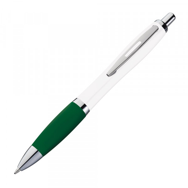 TOP PRICE! Kugelschreiber mit weißem Schaft, Metallclip, blauschreibender Großraummine und farbiger Softtouchgriffzone. Ihre Werbung drucken wir rechts vom Clip.