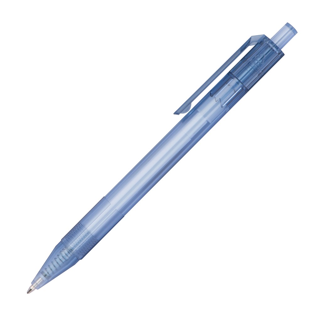 Umweltfreundlicher, transparenter Kugelschreiber aus recyceltem PET mit blauschreibender Großraummine, geradem Clip, Druckmechanismus und RPET Logo. Ihr Logo wird unterhalb vom Clip gedruckt.