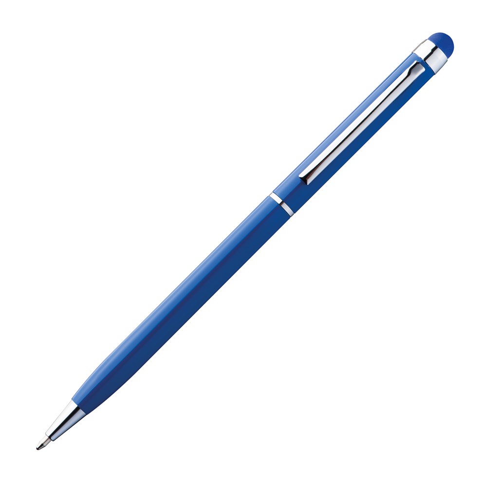 Metall Kugelschreiber aus Aluminium mit blauschreibender Systemmine und farblich angepasster Touch-Funktion oberhalb vom Clip. Ihre Werbung lasern wir rechts vom Clip.