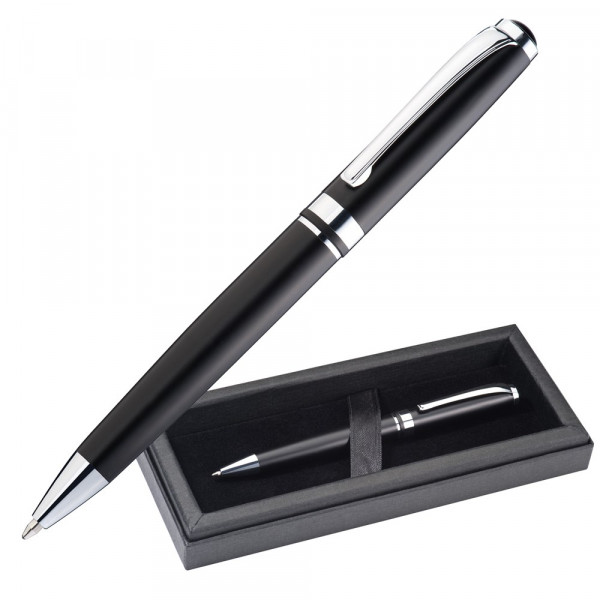 Metall Kugelschreiber in mattschwarz mit verchromten Applikationen, inkl. blauschreibender Metall Großraummine und elegantem Etui. Ihre Werbung bringen wir mittels Lasergravur auf der Kappe rechts vom Clip an.