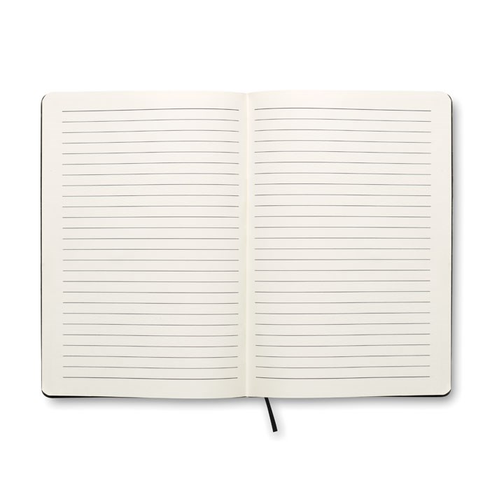 DIN A5 Notizbuch mit gebundenem Soft Cover aus PU. 80 Blatt (160 Seiten) liniertes Recyclingpapier. Kleines Fach im rückwärtigen Umschlag. Elastisches Verschlussband, Lesebändchen und Stifthalter.