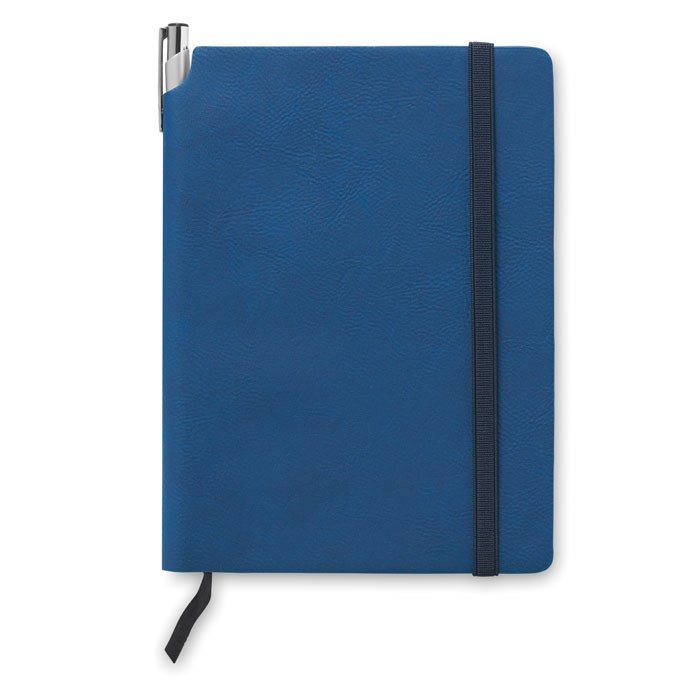 DIN A5 Notizbuch mit gebundenem Soft Cover aus PU. 80 Blatt (160 Seiten) liniertes Recyclingpapier. Kleines Fach im rückwärtigen Umschlag. Elastisches Verschlussband, Lesebändchen und Stifthalter.