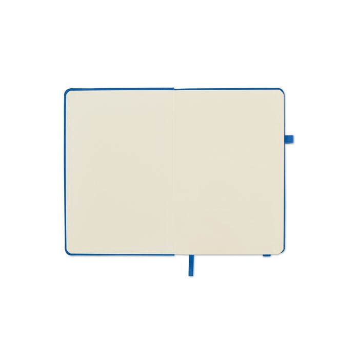 DIN A5 Notizbuch mit Hardcover aus 70% recyceltem Pre-Consumer-Leder und 30% PU-Latex. 96 Blatt (192 Seiten) liniertes Recyclingpapier. Mit farblich passendem elastischen Baumwoll Verschlussband und Stiftschlaufe.