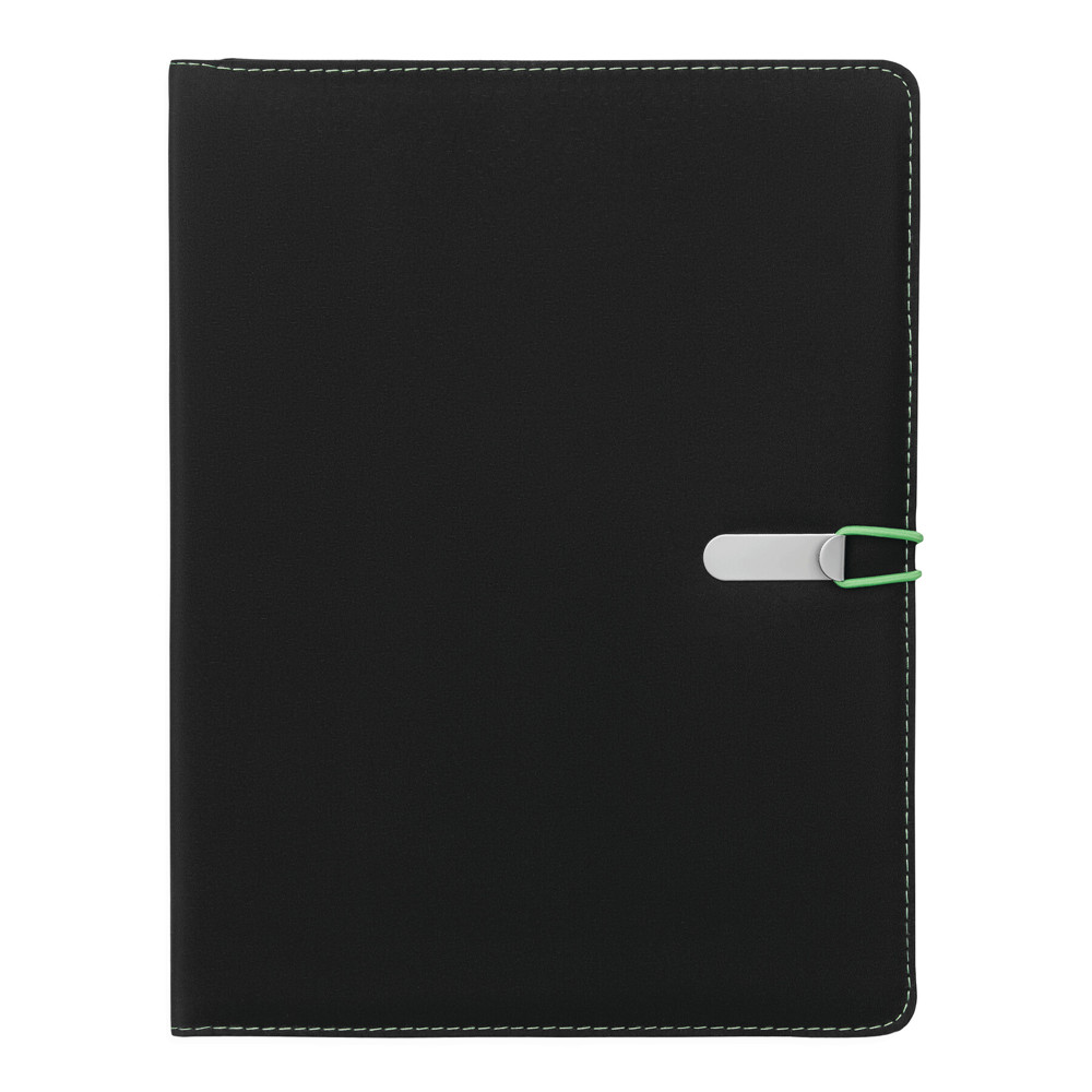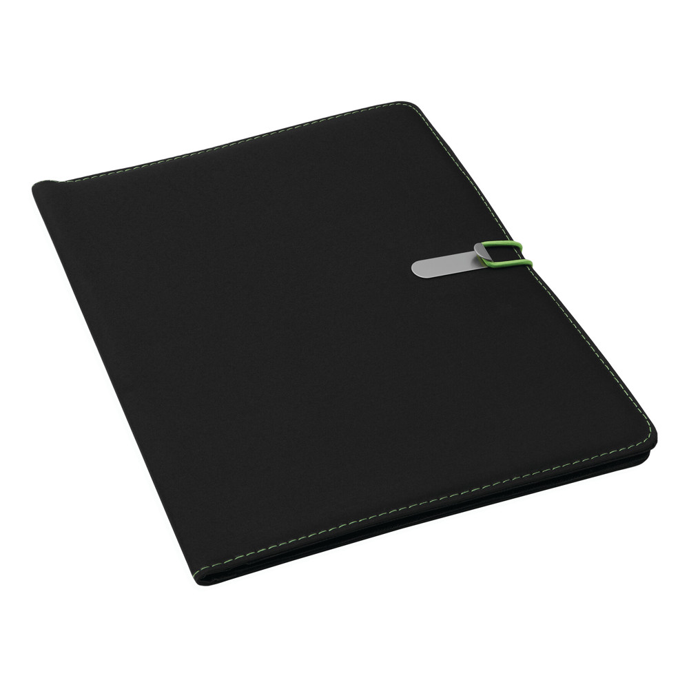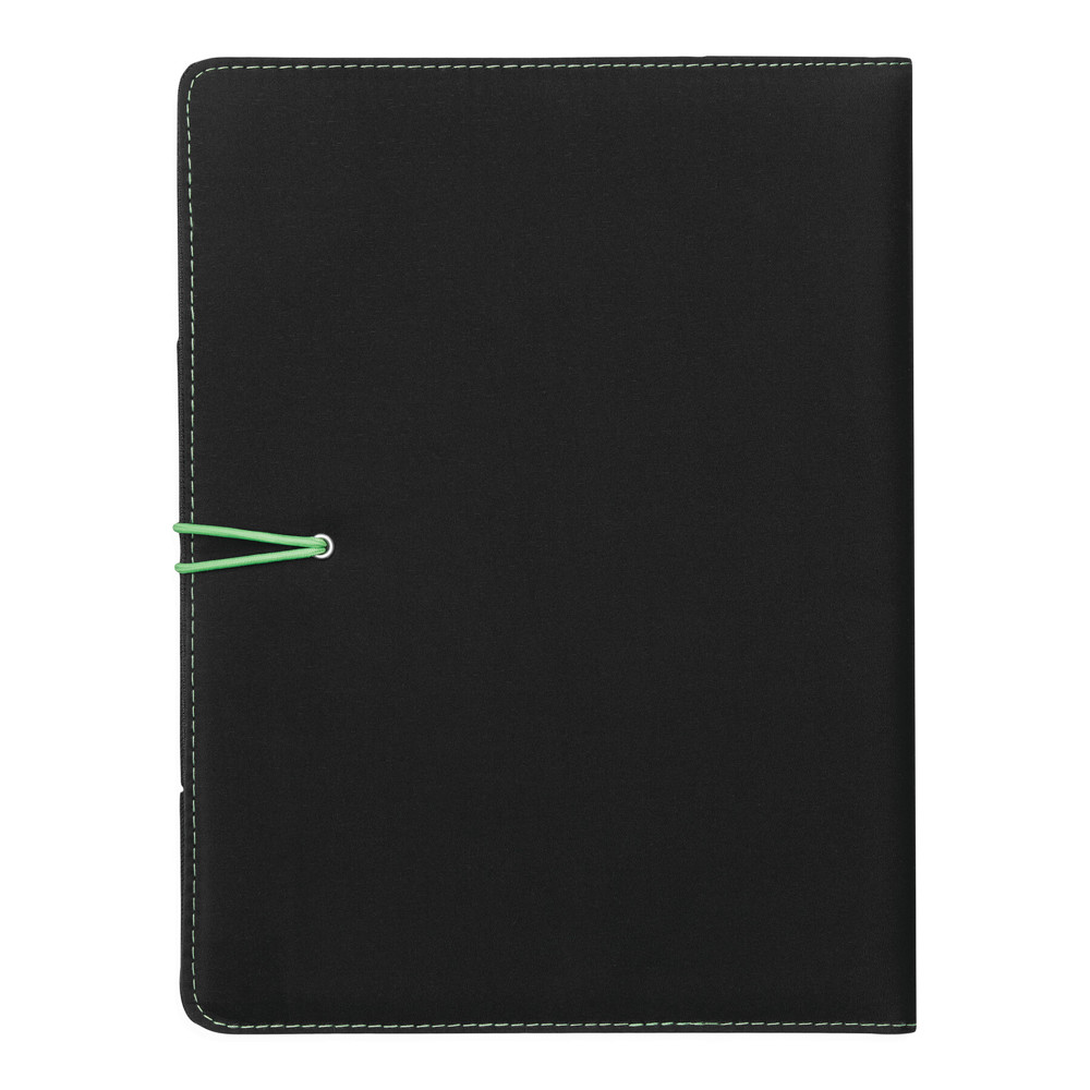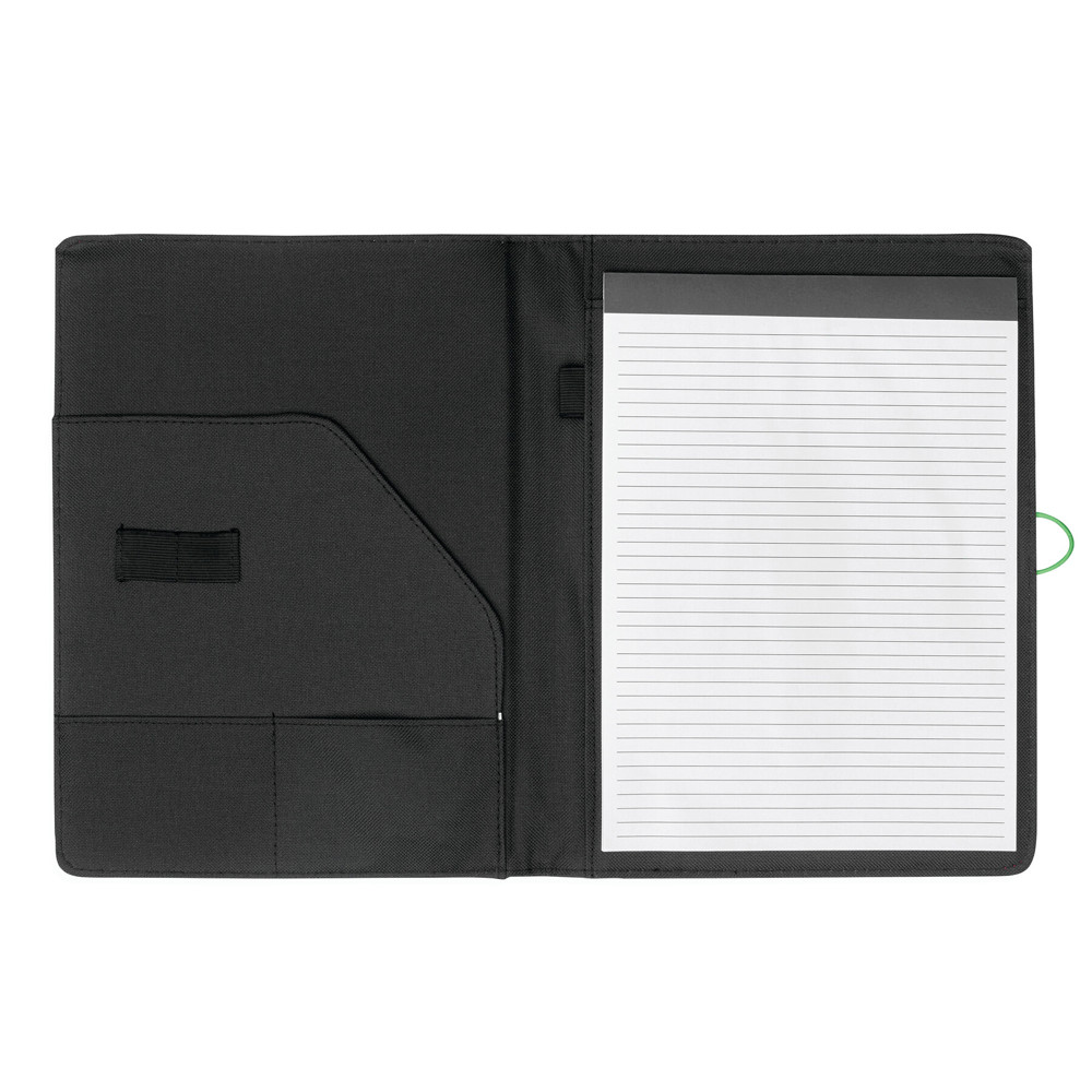 Konferenzmappe SESSION im DIN-A4-Format: Metallhaken mit farbigem Gummiband zum Verschließen, innen diverse Einsteckfächer, 2 elastische Schlaufen, inkl. Schreibblock (liniert), Schlaufe für 1 Schreibgerät, außen mit farbigen Ziernähten