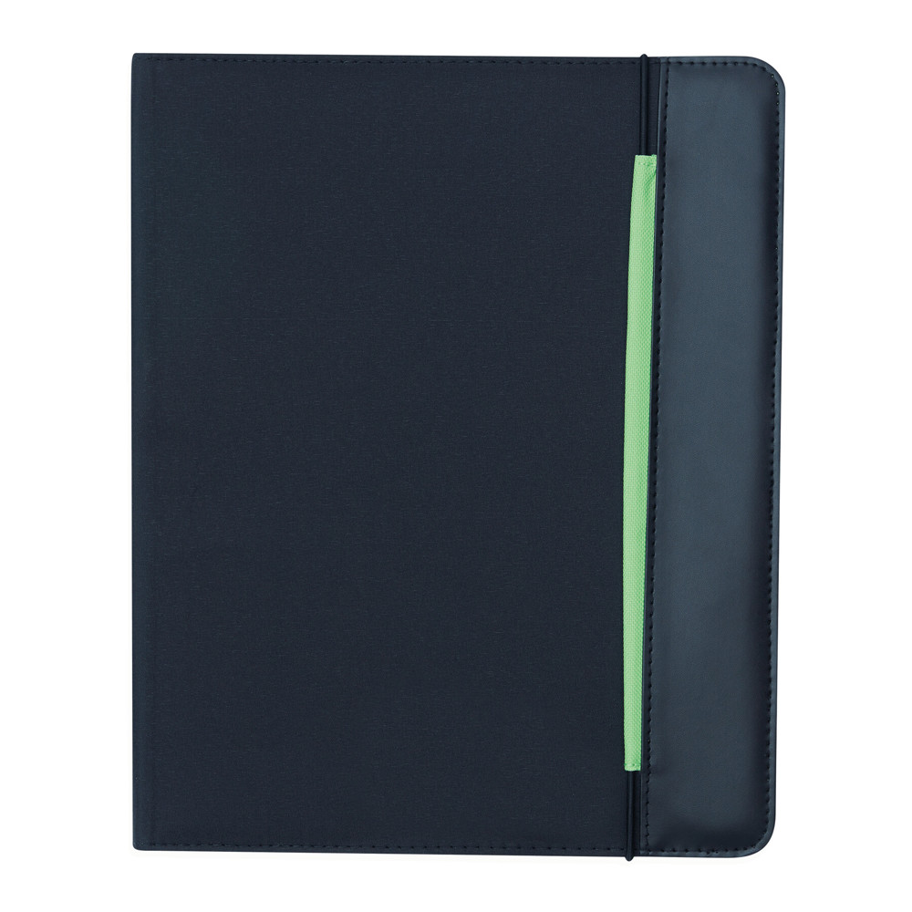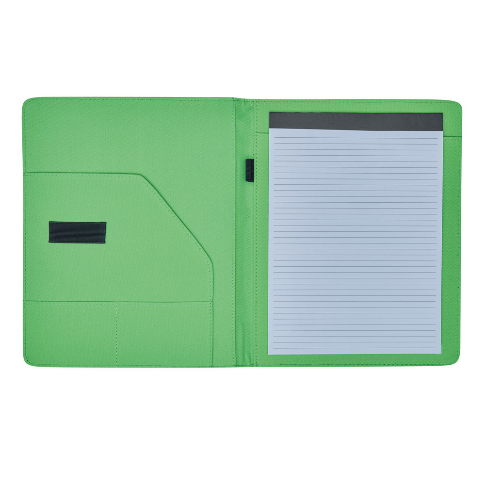 Konferenzmappe YOUNG STAR im DIN-A4-Format: Gummiband zum Verschließen, innen diverse Einsteckfächer, inkl. Schreibblock (liniert), Schlaufe für 1 Schreibgerät, innen farbig abgesetzt - außen schwarz mit farbigem Zierstreifen