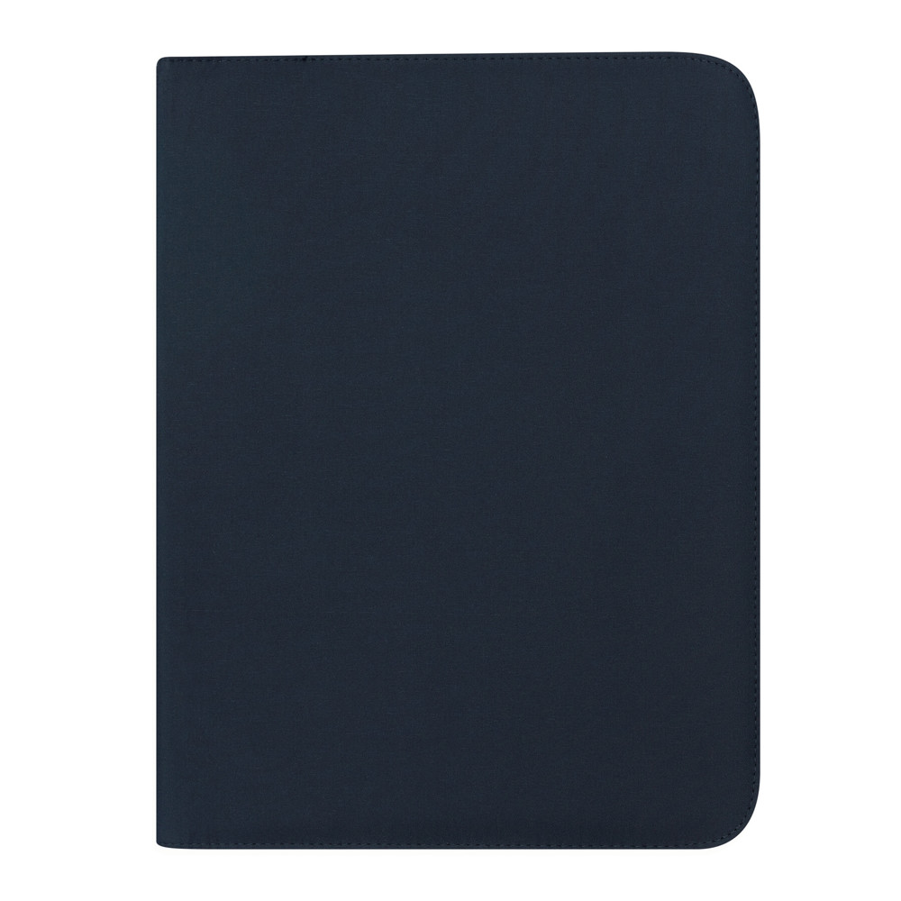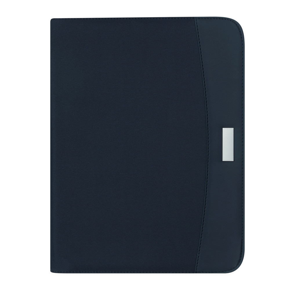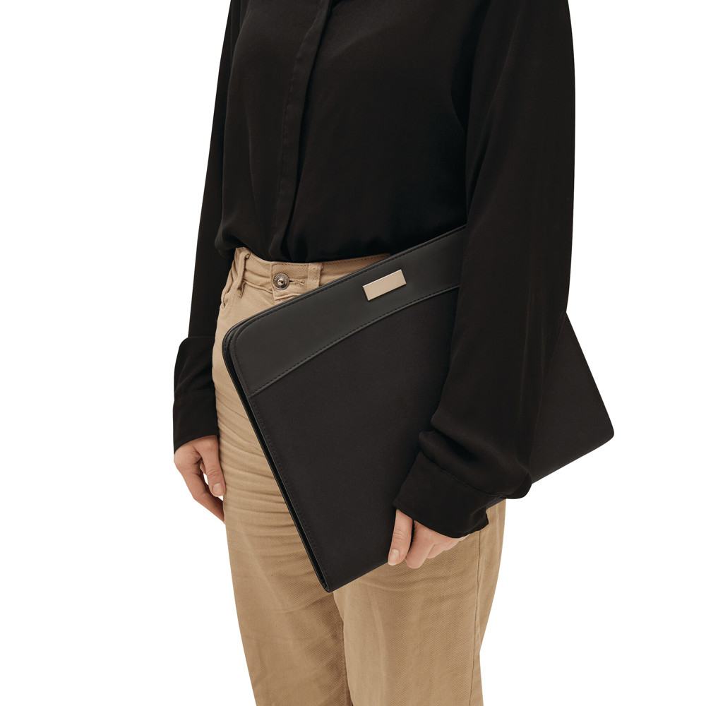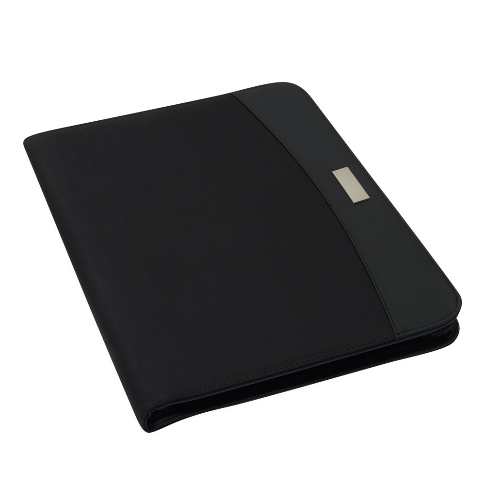 Portfolio CREADO im DIN-A4-Format: umlaufender Reißverschluss zum Verschließen, innen diverse Einsteckfächer, 1 Klarsichtfach, 1 Reißverschluss-Innenfach, 1 Klettverschluss-Fach mit Organizer für 8 CDs/DVDs, inkl. Schreibblock (blanko), Schlaufe für 1 Schreibgerät, mit Aluminiumplättchen für Ihre Werbeanbringung