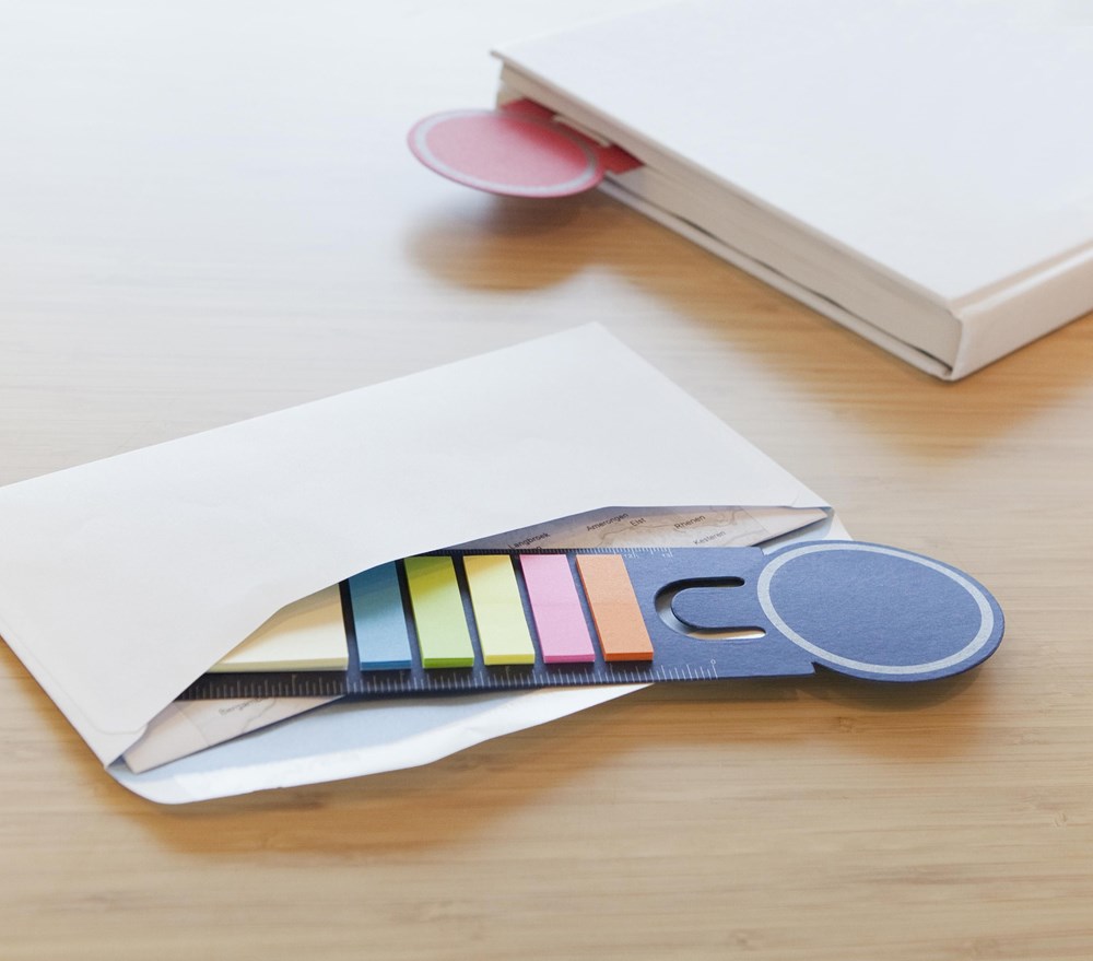 Lesezeichen aus Pappe, inklusive Haftnotizen (klein und groß) und Linealaufdruck.