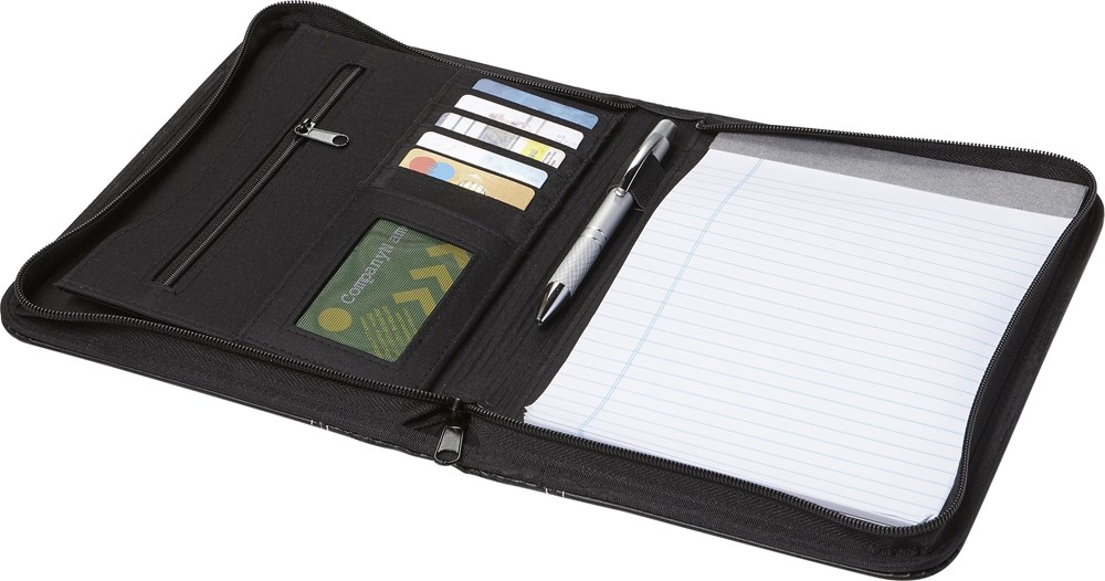 Dokumententasche aus PU, ca. DIN A5-Format, mit weißen Ziernähten, Reißverschluss, diversen Fächern, Stifthalter (ohne Stift) und Schreibblock (liniert).
