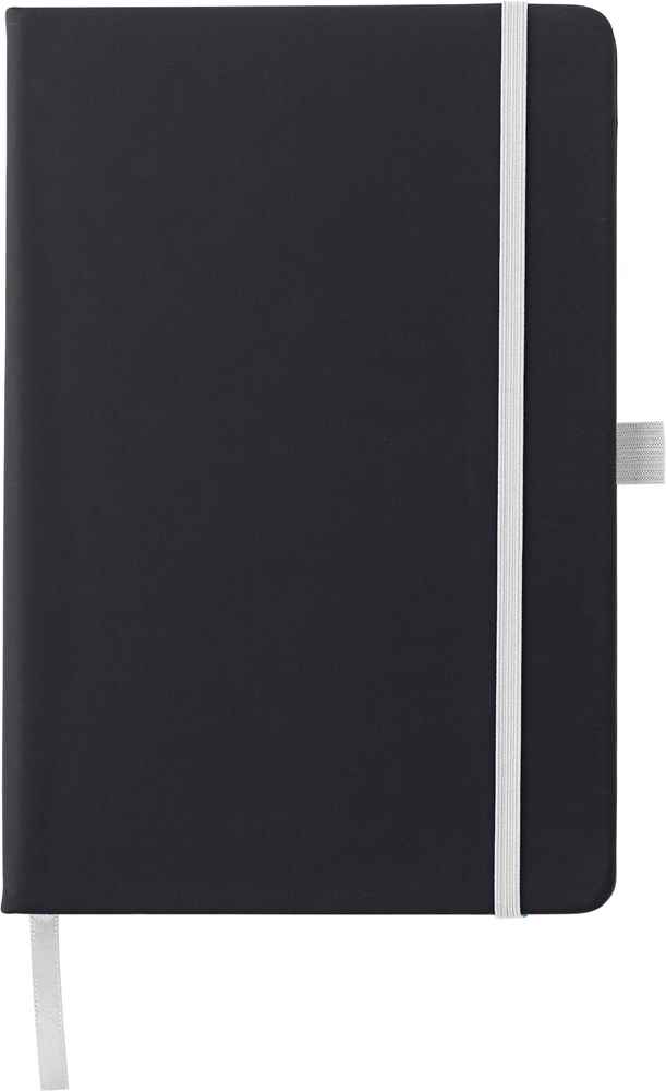 Notizbuch aus PU mit 96 linierten Seiten und einem Cover, welches mit einem Gummiband verschlossen wird. Wenn das Cover gelasert wird, hat das Logo die gleiche Farbe wie das Gummiband.