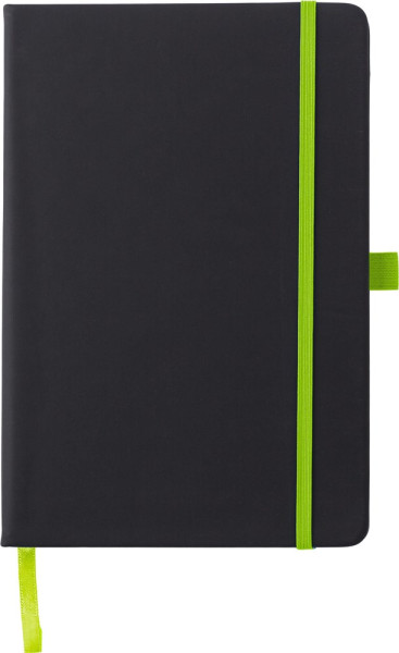 Notizbuch aus PU mit 96 linierten Seiten und einem Cover, welches mit einem Gummiband verschlossen wird. Wenn das Cover gelasert wird, hat das Logo die gleiche Farbe wie das Gummiband.